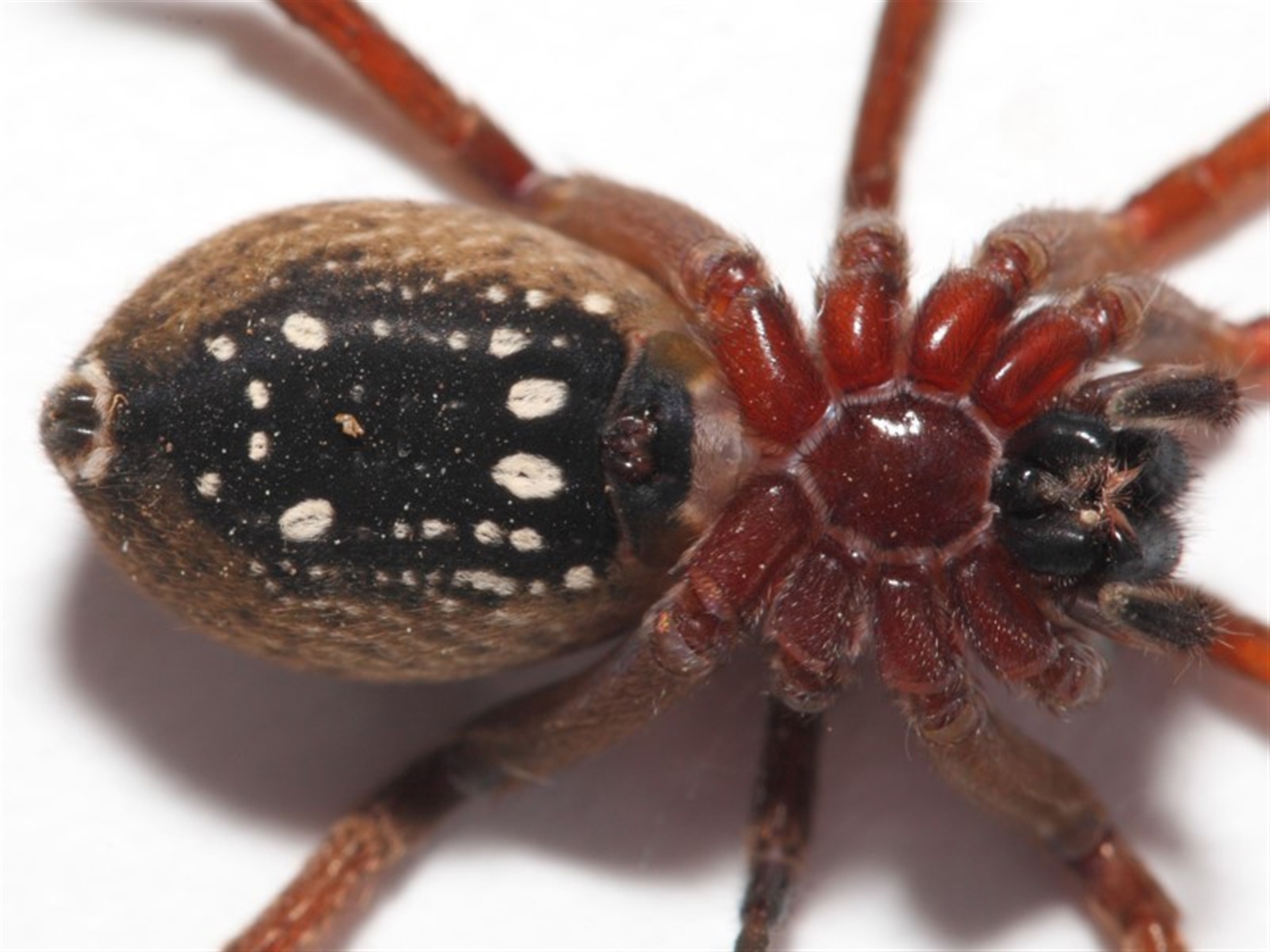 A female. The abstract artwork under the abdomen, with four larger white spots and other smaller ones, is typical of this species.