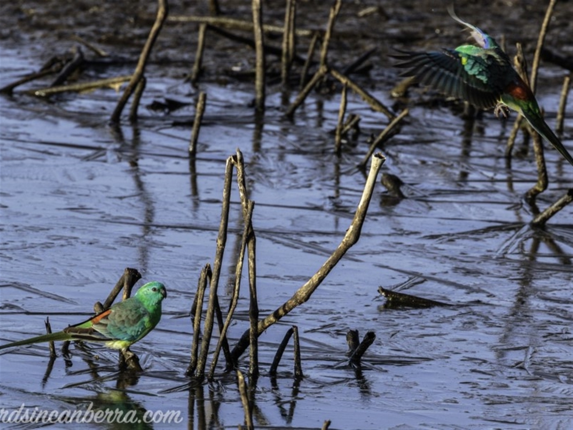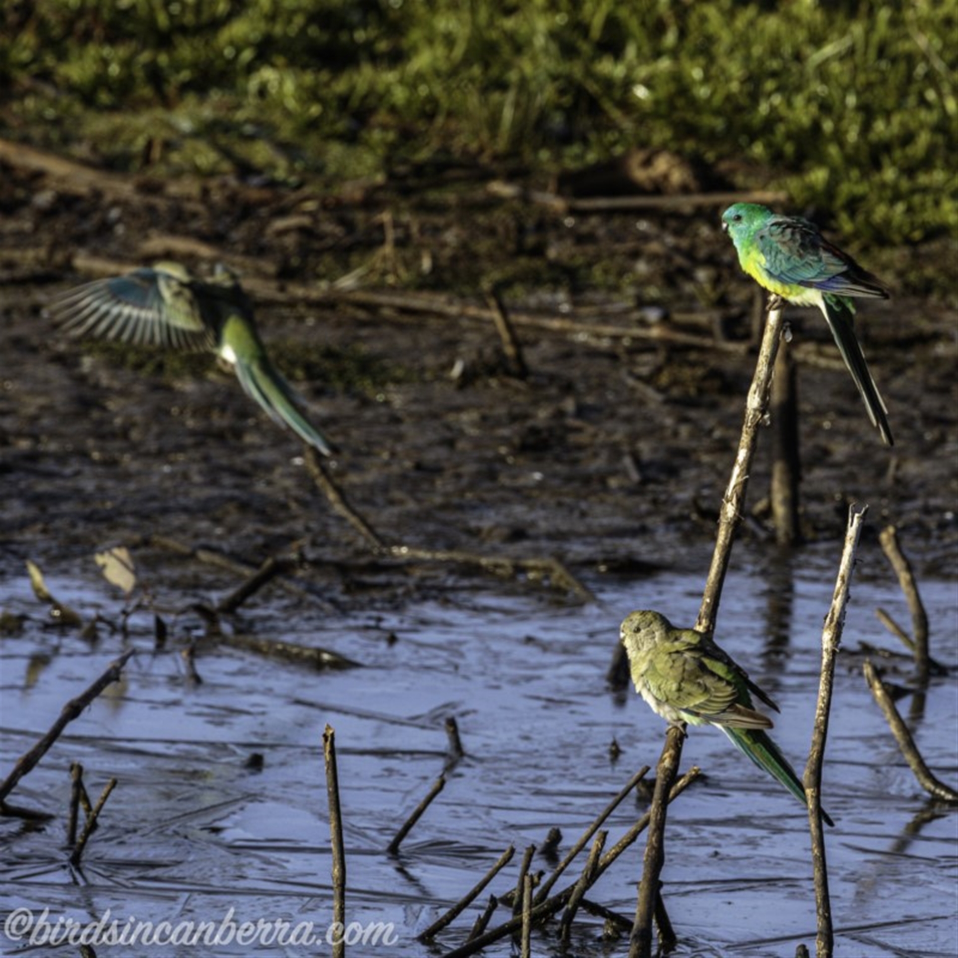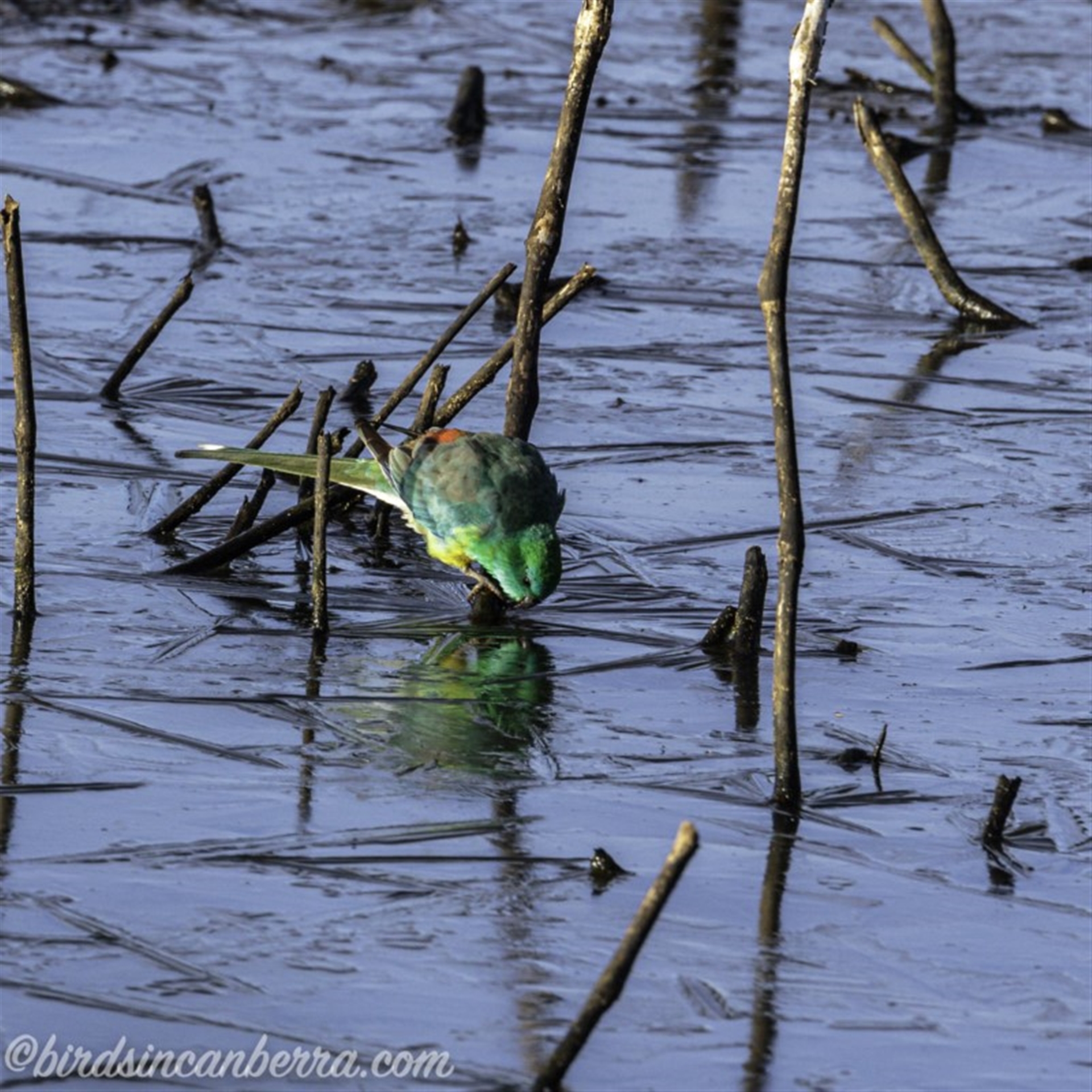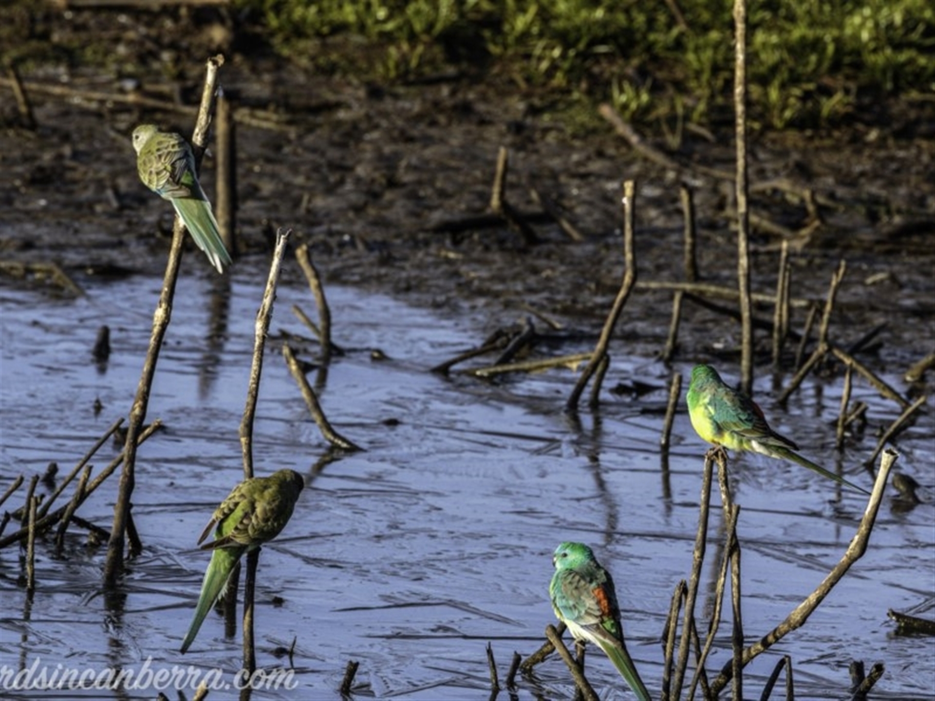 Four Red-rumped Parrots arrived at this slightly frozen pond for a drink There was possibly enough of a gap in the ice to allow the birds to drink. There were two males and two females in this area, although a few metres away, in the grass surrounding the pond, there were more of these parrots. The birds in the grass appeared to be feeding.