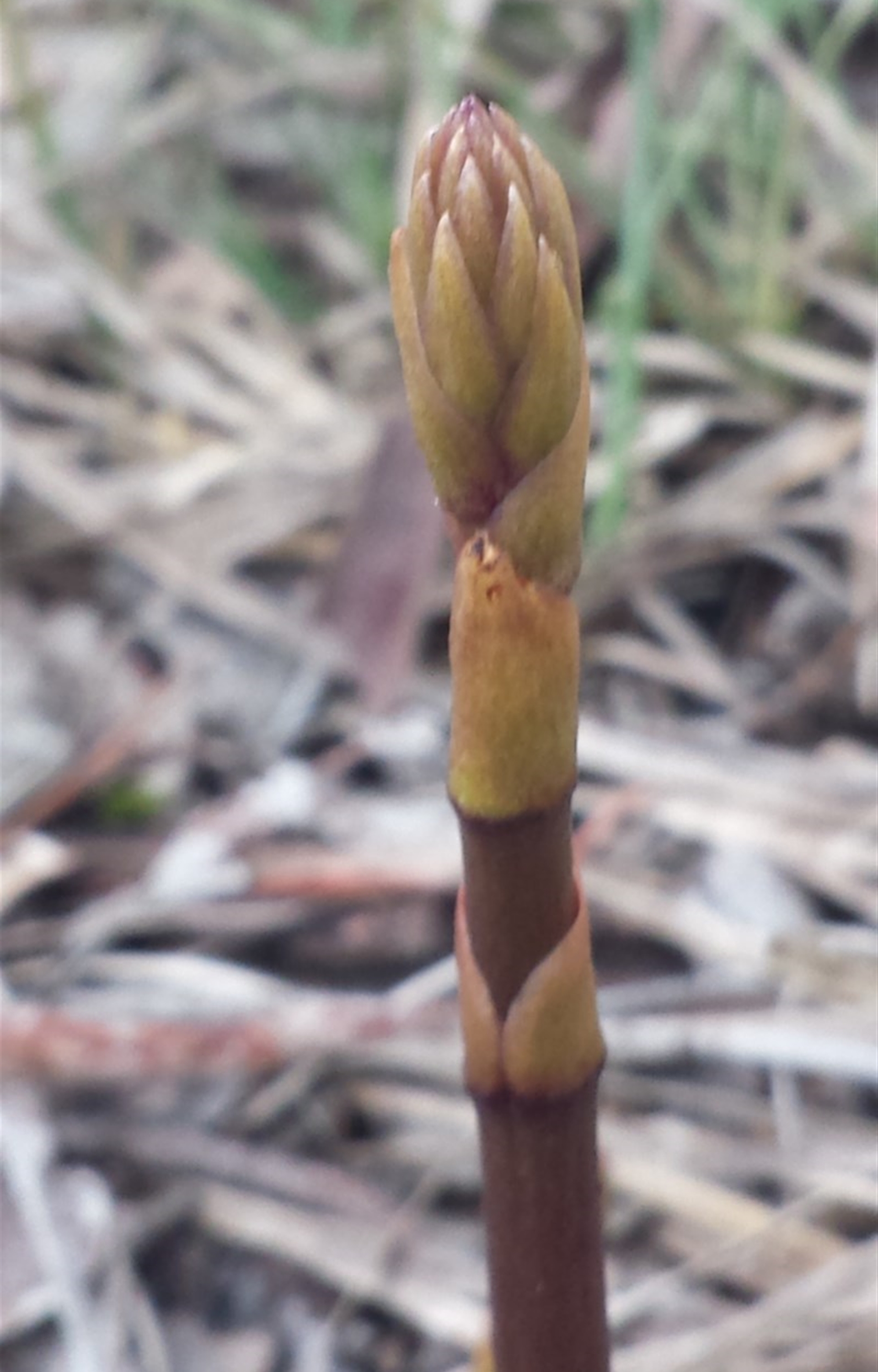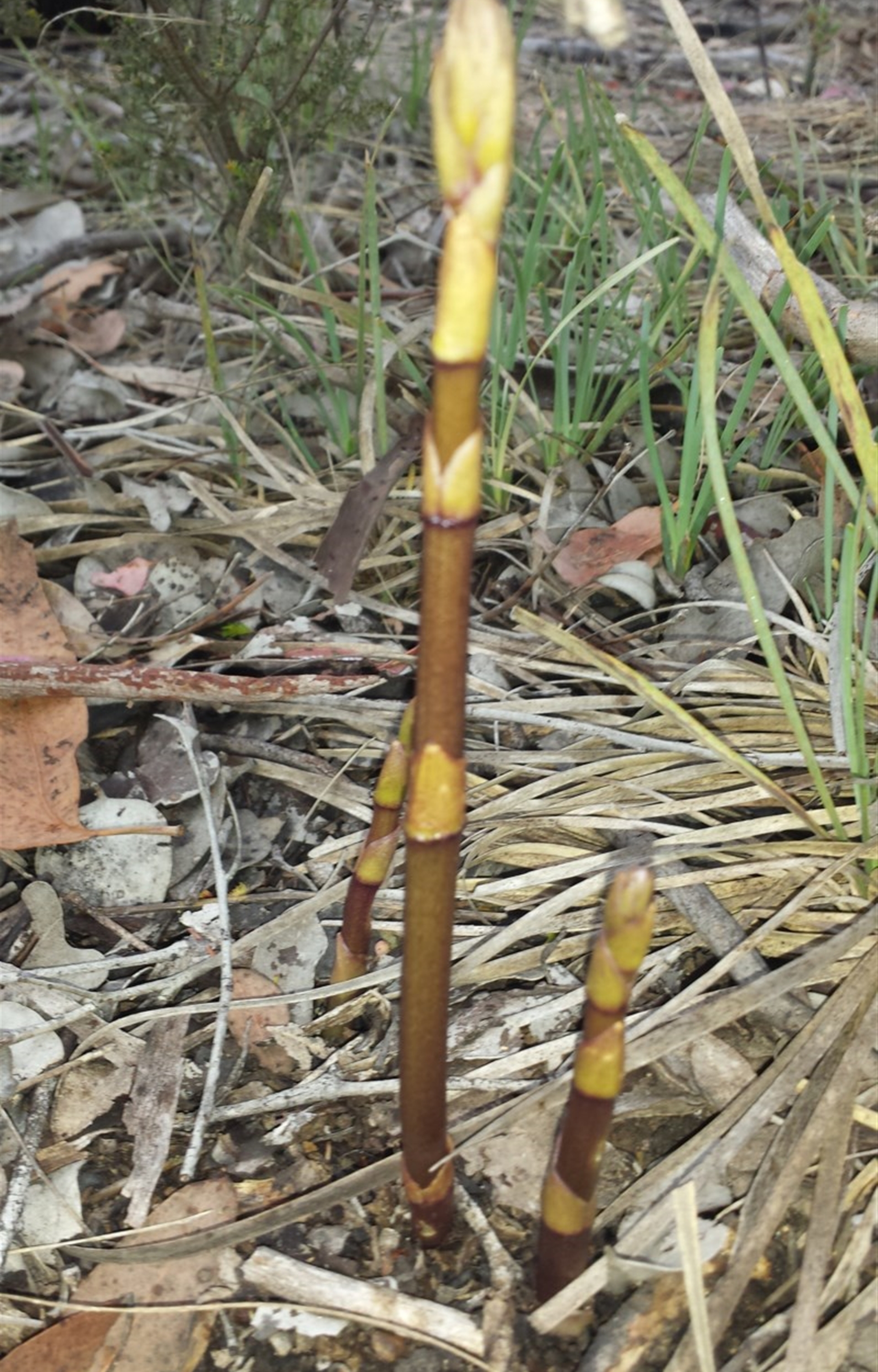 Dipodium often turn up in gardens. I photographed some D. punctatum last year growing in the front yard of a house in Duffy. This species probably is D. roseum, but need to see a flower.