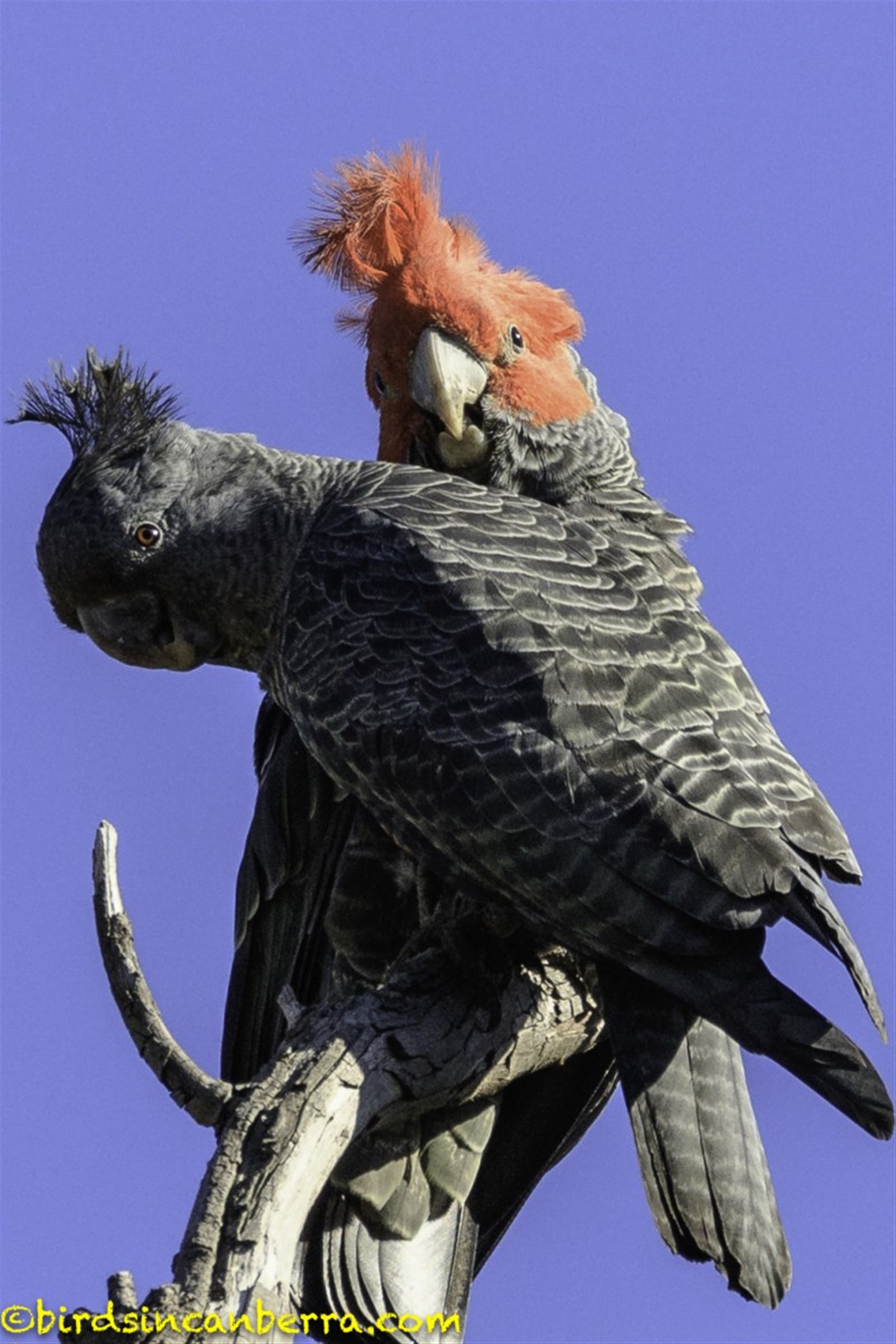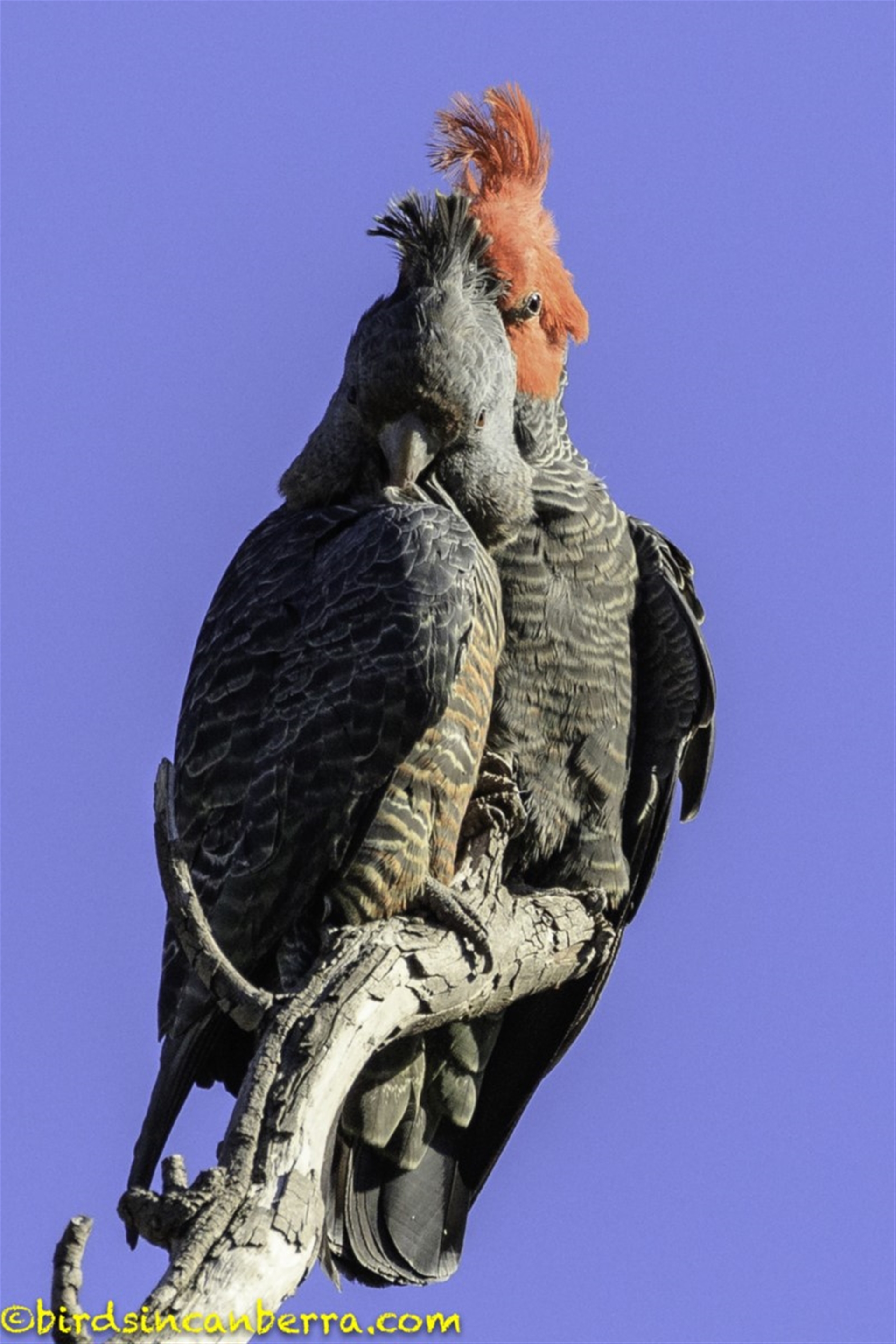 Further around from the Galahs to the east was a tree with three Gang-gang Cockatoos. There was a pair up high, with the male making occasional noises and the pair was carrying our mutual preening. There was also a lone male on the lower branches constantly calling but it was not being challenged by the male higher up.