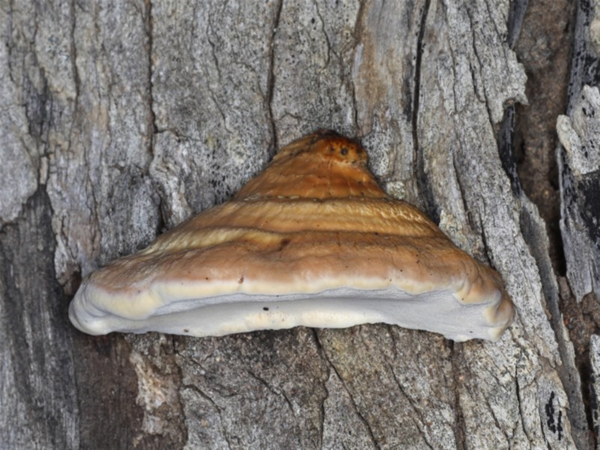 jb2602 Canberra & Southern Tablelands NatureMapr Truncospora ochroleuca Pored or somewhat maze-like on underside [bracket polypores] Shelf-like to hoof-like & usually on wood FungiSynonyms