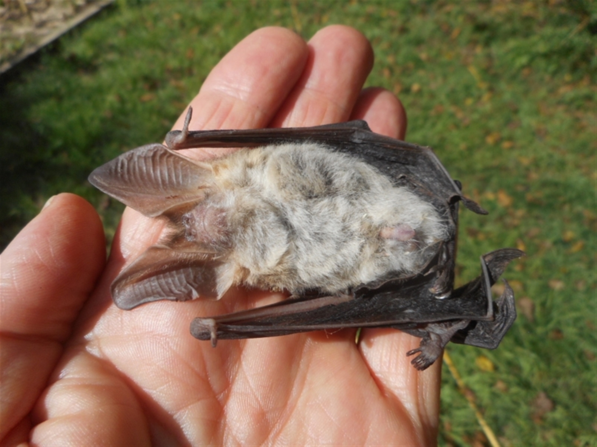 Found dead at base of house wall. Ears joined by skin over the top of the skull. Forearm length 42.5 mm
