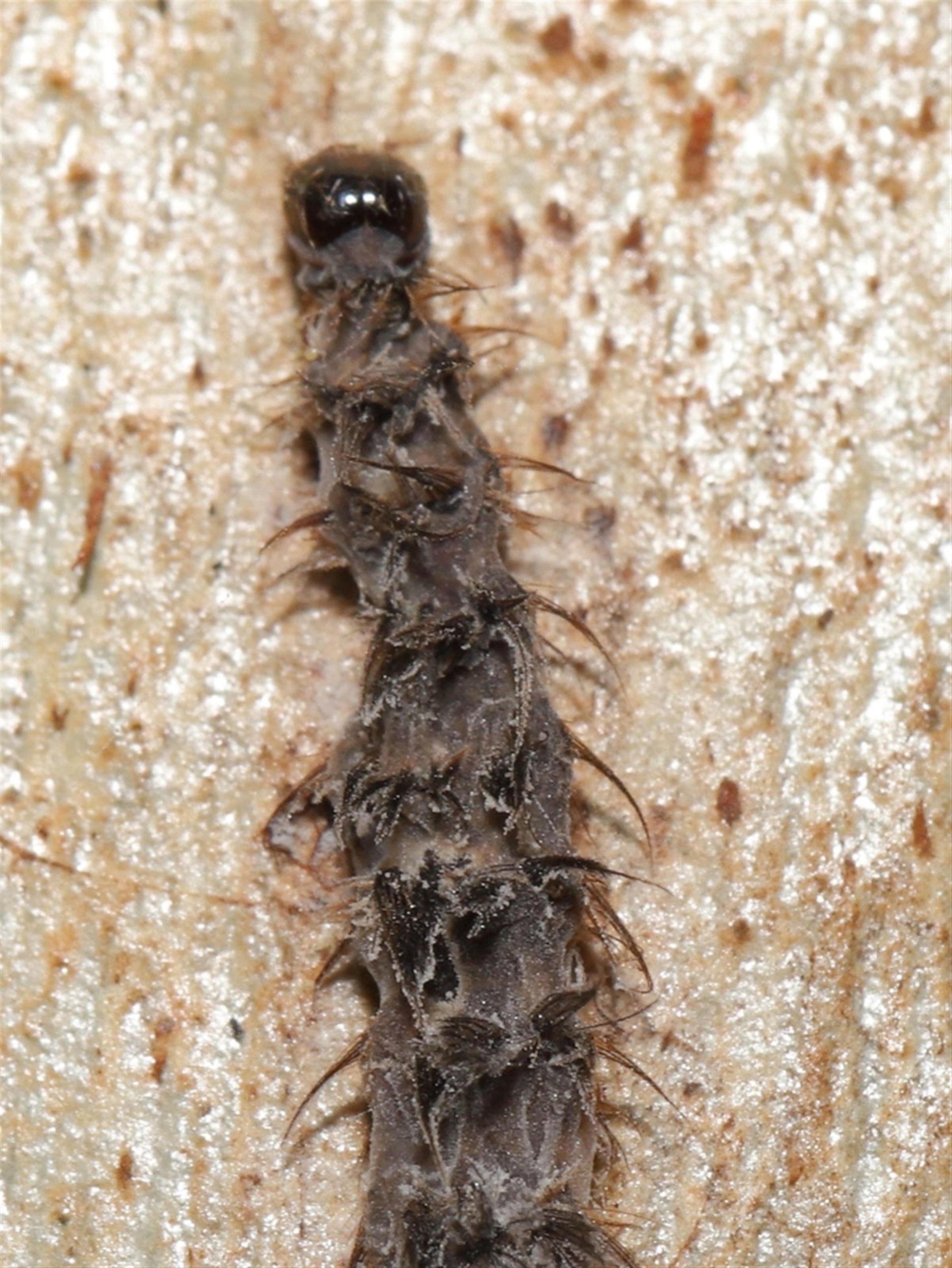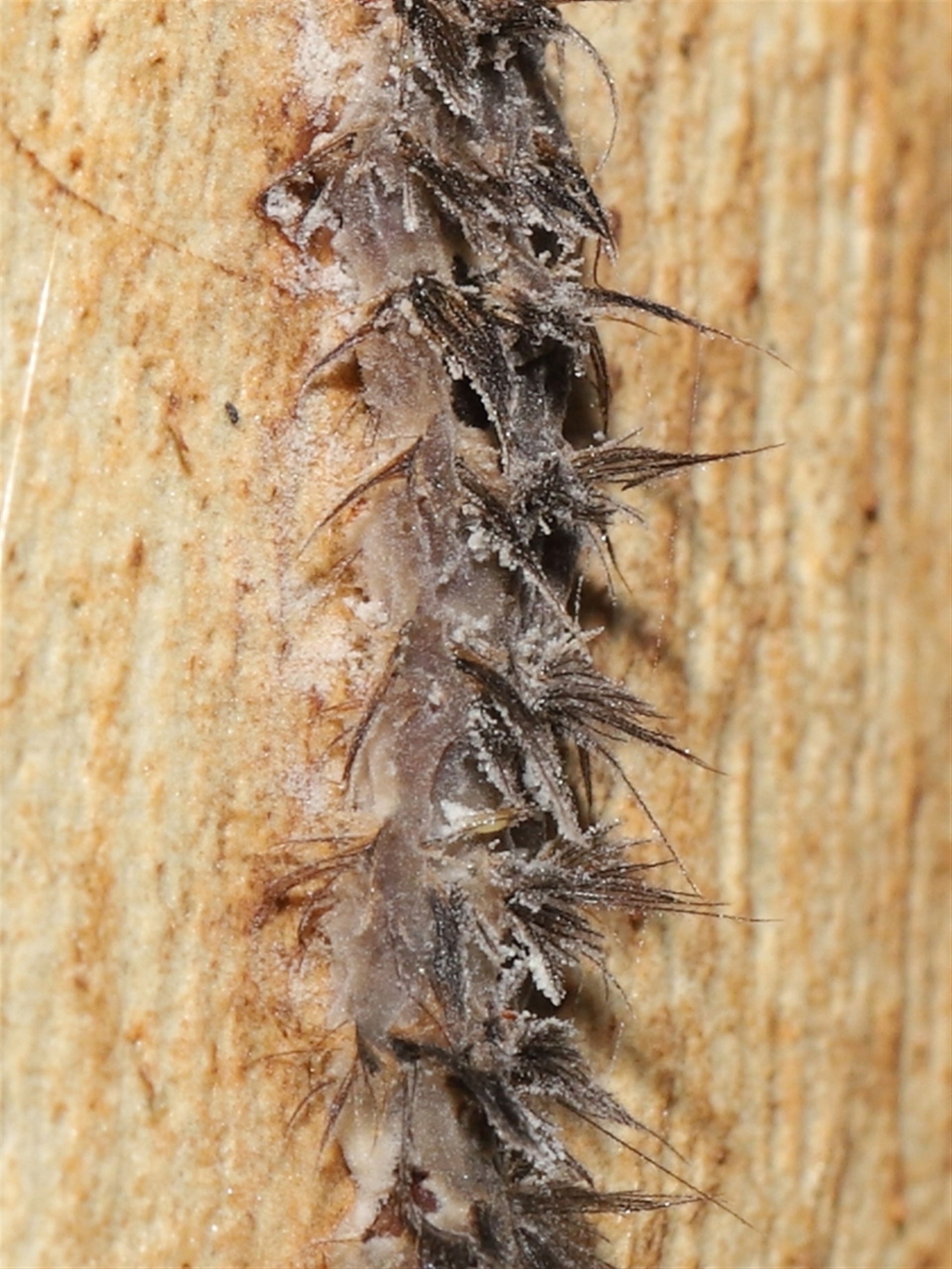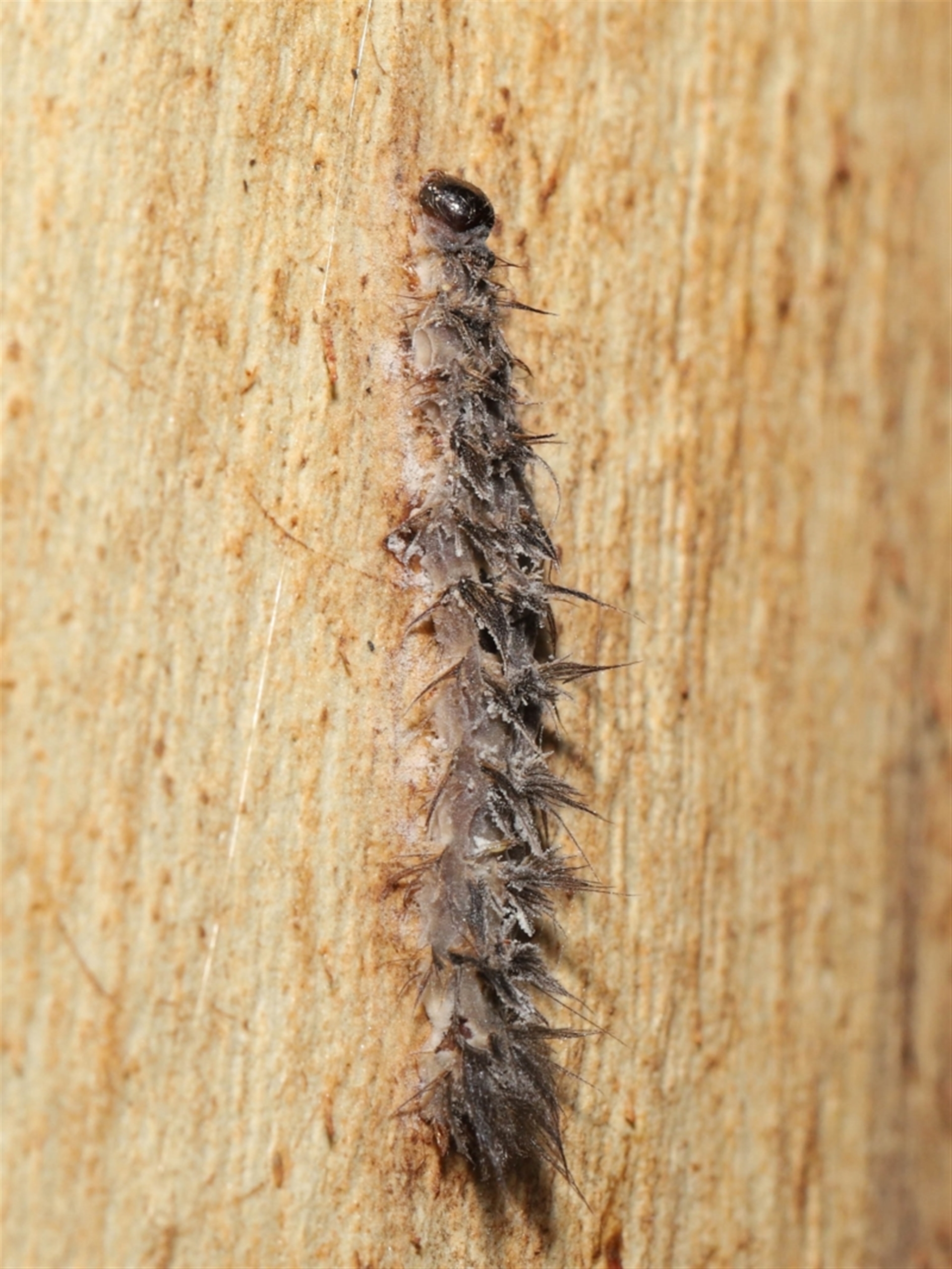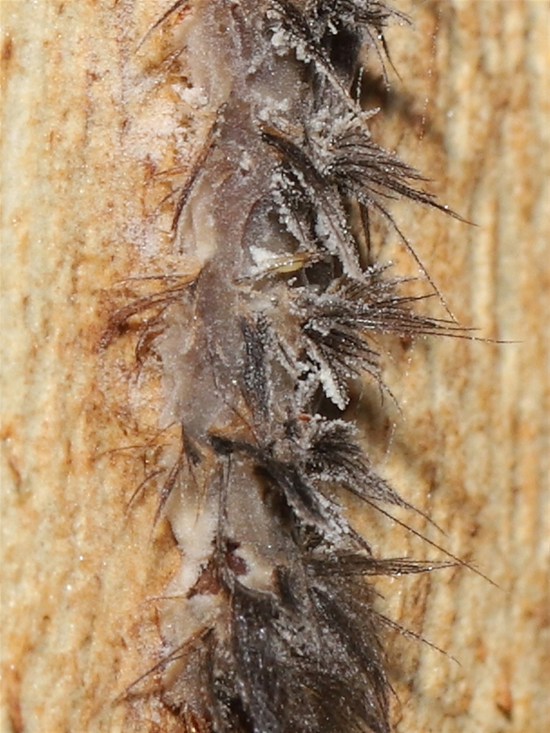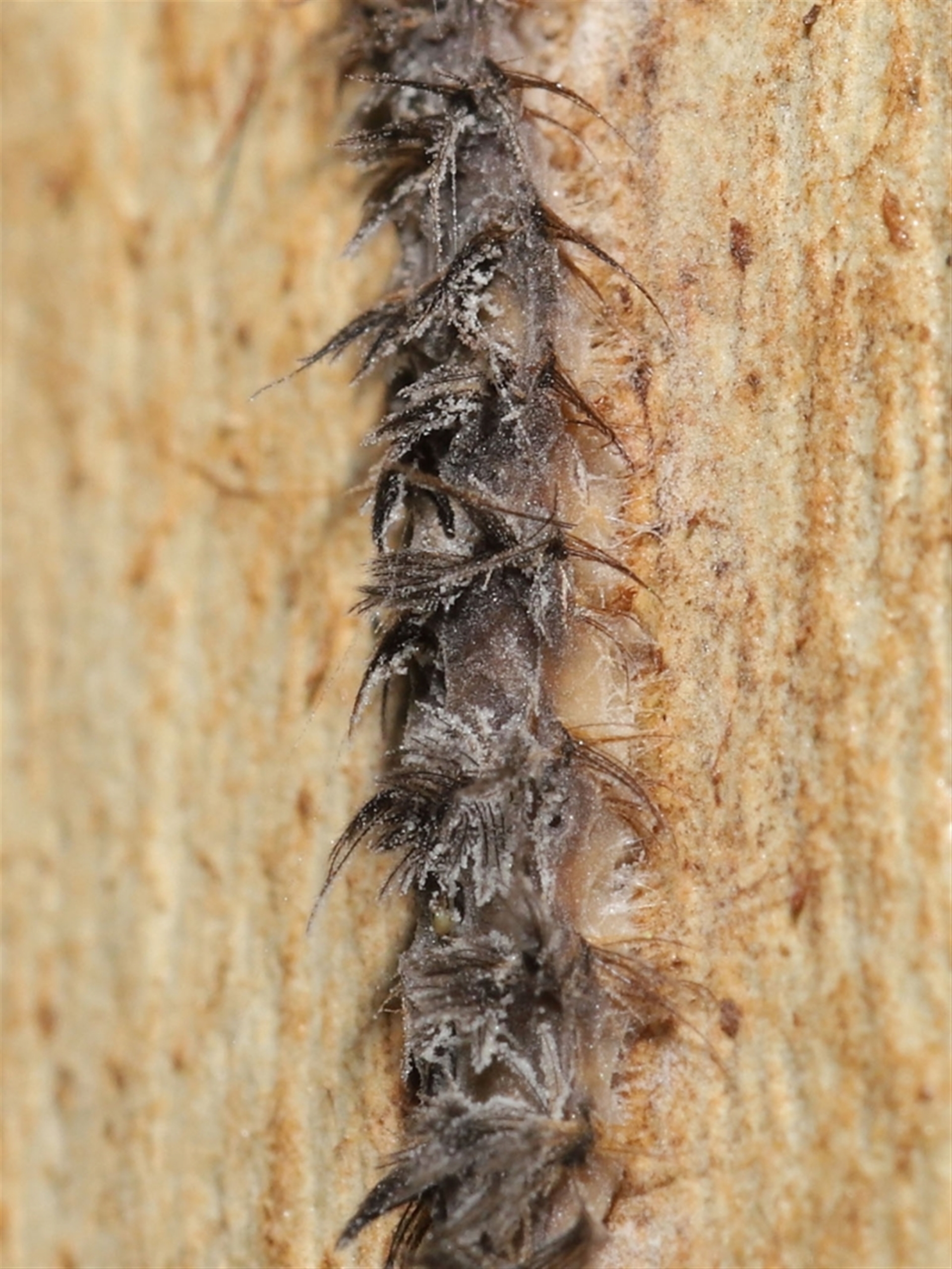The caterpillar appears to have been infected by a fungus similar to Puppeteer fungus. There are spores on the tree surrounding the caterpillar and spores bursting out from its body that appear similar in appearance to those seen on flies affected by Puppeteer.