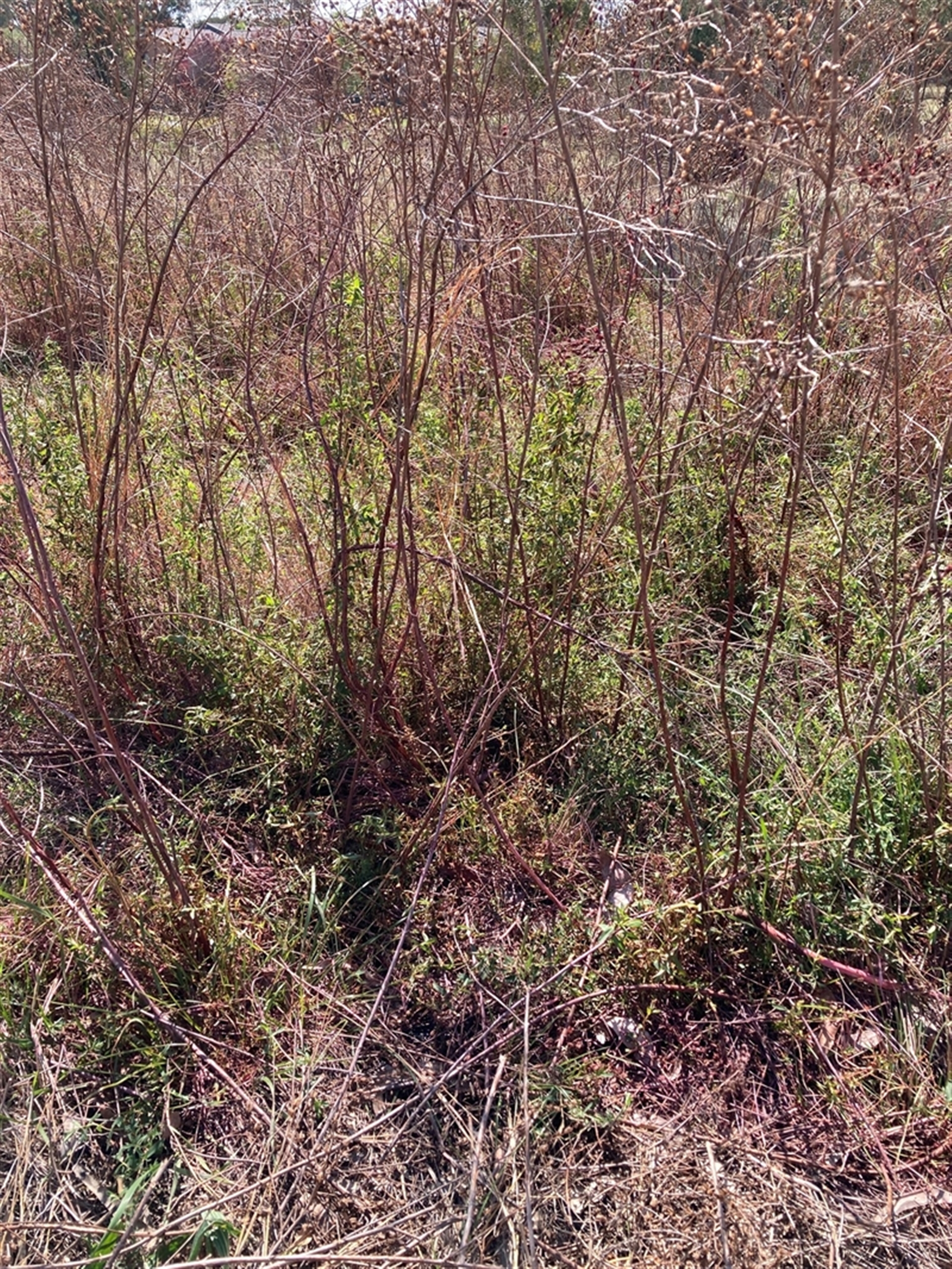 In grassy woodland restoration site. Patches of StJW with regrowth of large rosettes in area which was mapped as being sprayed with Grazon in Jan 2024 by contractor. Perhaps patches were deliberately not sprayed because the closeness of trees?