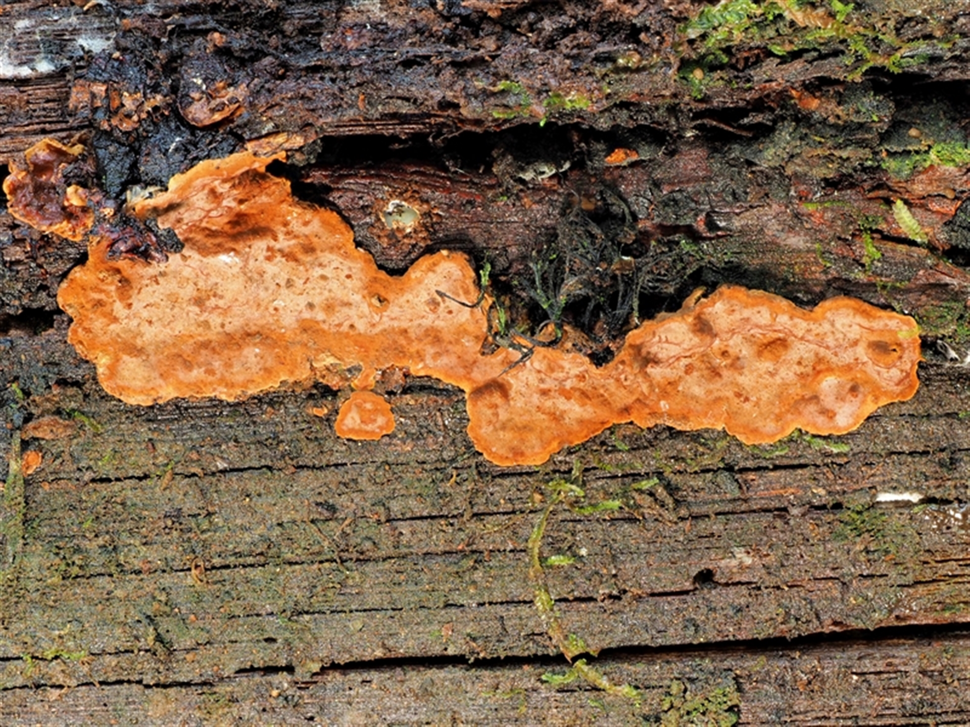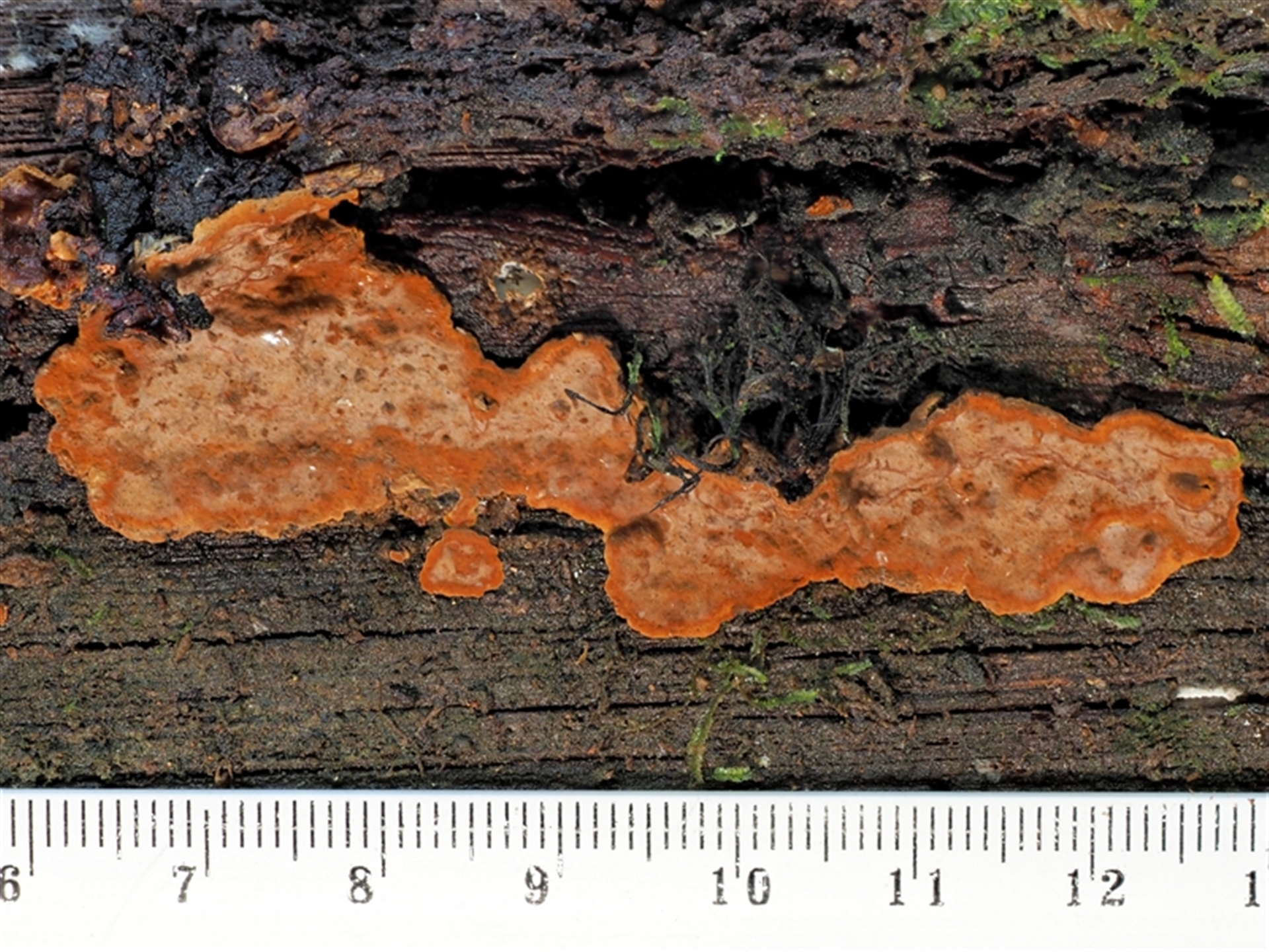 Last image appears to show some fine dark hairs on the left side. Three patches of fruit body on the side of a dead log.