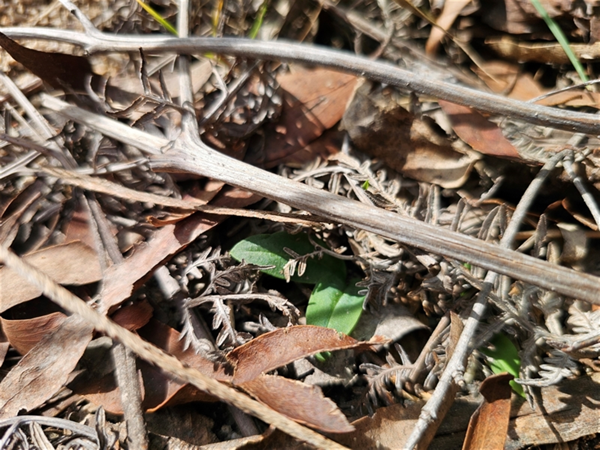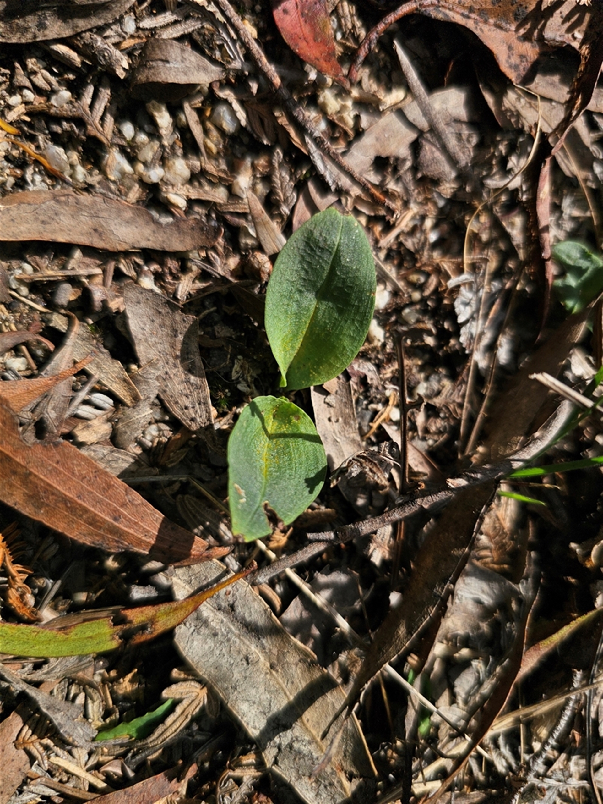 Very large colony spreading a great distance. Found only one plant in flower, pollinated and closing. Acianthus leaves interspersed through entire colony.